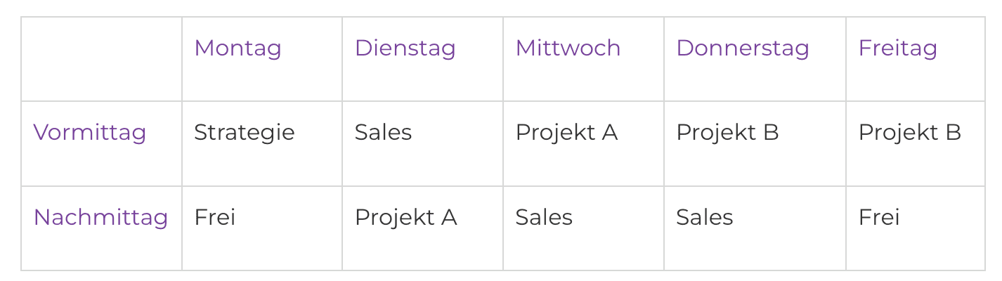 Day-Theming hilft dabei, den Überblick über die Woche zu behalten und wichtige Aufgaben nicht zu vergessen. Jeder Tag hat ein spezielles Thema oder eine spezielle Art von Aufgaben, um die Produktivität zu steigern und alle Bereiche abzudecken. Beispielsweise könntest du den Montag als Tag für Meetings festlegen, den Dienstag als Tag für die strategische Planung und den Mittwoch als Tag für die Ausführung von Projekten. Leider ist das häufig im Alltag nicht realisierbar. Insbesondere von Tätigkeiten, die eine schnelle Reaktion auf eine Kundenanfrage erfordern. Und hier kommt nun endlich die 10-Teile-Woche ins Spiel.